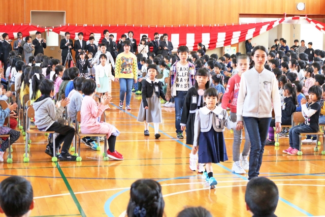 入学式で6年生と一緒に入場する新1年生=6日午前、剣野小 (2018/04/06)