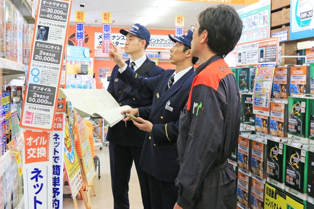 店内のオイル売り場を確認する市消防署員ら=5日、オートバックス柏崎店 (2018/04/11)