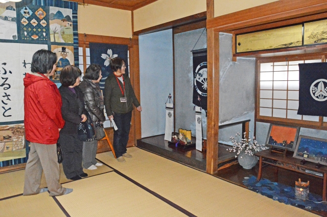 萌の会の「藍古布作品展」。味わい深い作品で、つるし雛かざりとともに多くの関心を集めている=市内新道の飯塚邸 (2018/04/12)