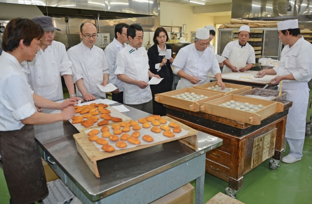 スイーツ専用米粉「菓心米」を使った研修会。職人たちが商品開発を目指し、和洋菓子の技を磨いた=市内松波4、最上屋工場 (2018/04/13)