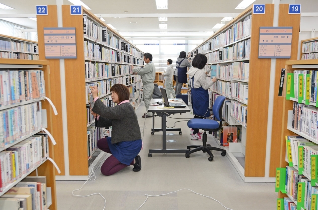 特別整理休館中のソフィアセンター。さらに使いやすい図書館を目指し、端末機器を使って蔵書を点検する職員たち=16日
