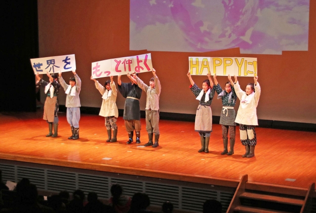 西山ハッピープロジェクトで劇「内郷の戦中戦後物語」を上演し、平和の大切さを呼び掛けた内郷小6年生=18日、西山ふるさと館