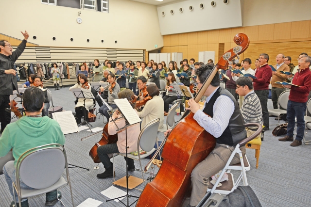 柏崎音楽協会設立20周年記念の演奏会に向けた合唱団とオーケストラの合同練習=18日、市民プラザ