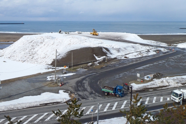 巨大な“雪の台地”となった市の雪捨て場。ダンプカーや重機がミニカーのようだ=市内東港町