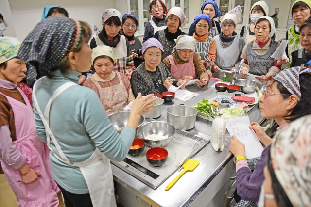 消費者協会の料理講習会。シフォンケーキの技を習った=18日、市民プラザ