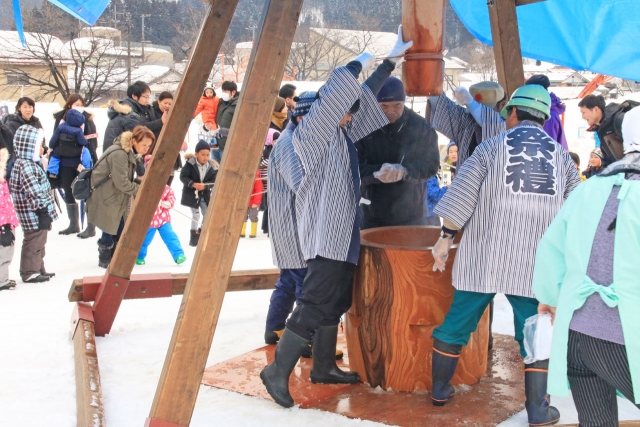 恒例の巨大餅つきなどにも人気を呼んだ「雪まつり」=25日、高柳中グラウンド