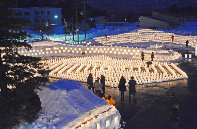 雪と3千本のろうそくの明かりで楽しませた「キャンドルフェスタ」=24日、野田コミセン前広場