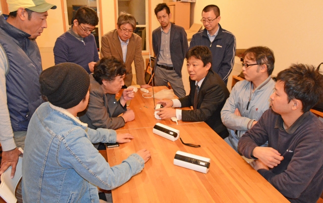 最終試作機が完成した「いのちつなぐラジオ」。受信感度などを確認した=13日夜、市内東本町2のえんま通りトレーラーハウス