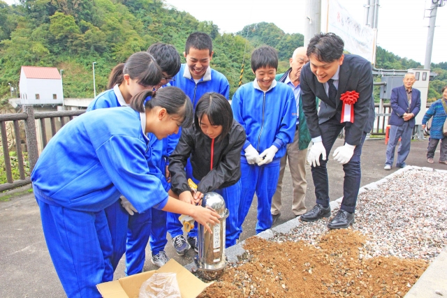 04年当時の高柳小、門出小5・6年生が書いた作文の入ったタイムカプセルを開ける今井さん(右)と高柳中1年生=市内高柳町栃ケ原
