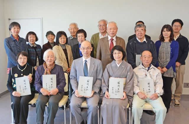 記念誌の発刊を喜び、お祝いの会を開いた「柏崎日記」を読む会会員=17日、シーユース雷音