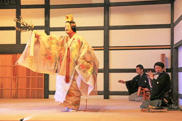 「貞観園」の国の名勝指定80周年を記念して行われた「能」高柳公演。優雅で幽玄な世界で魅了した=18日、市内高柳町岡野町