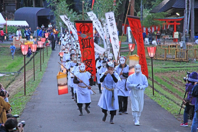 狐の夜祭りのちょうちん行列。栃ケ原神社を出発し、漆島に向かった=8日