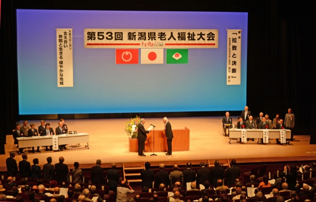 県老人福祉大会で行われた表彰式。功労者などがたたえられた=12日、アルフォーレ