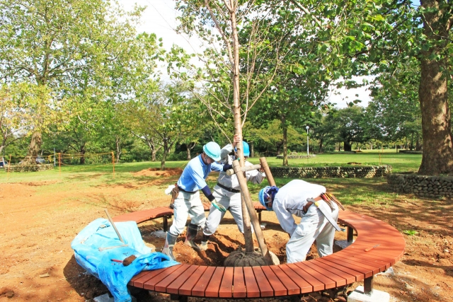 赤坂山公園の芝生広場で行われている桜の植樹。入り口に近い場所にサークルベンチを置き、その中に高さ4.5メートルのソメイヨシノをシンボルツリーとして植えた