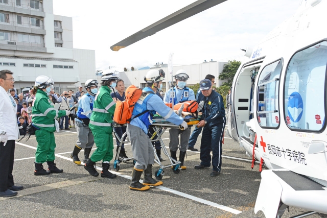 病院祭で実施されたドクターヘリによる患者搬送訓練。大勢の関心を集めた=14日、医療センター駐車場