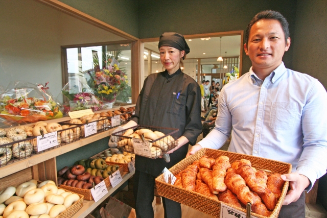 21日から本格オープンするベーグルとクロワッサンの店「びわじまベーカリー」。右は飯塚社長=市内穂波町