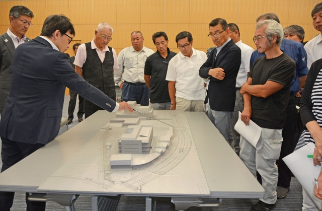 市役所新庁舎の模型(手前)などを示しながら行われた基本設計の市民説明会=29日、市民プラザ