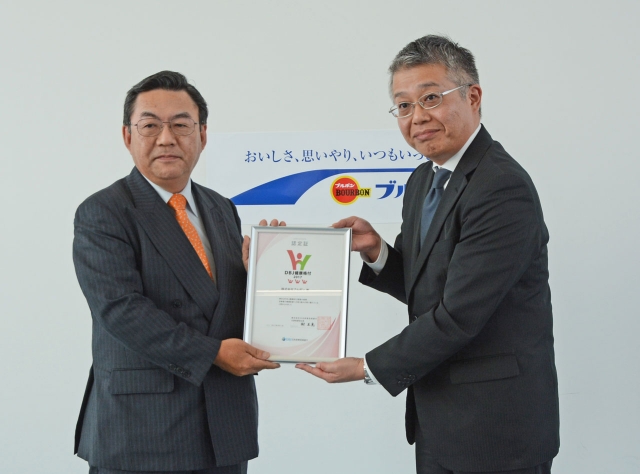 DBJ健康格付の認定証を受けるブルボンの吉田社長(左)=31日午後、同社