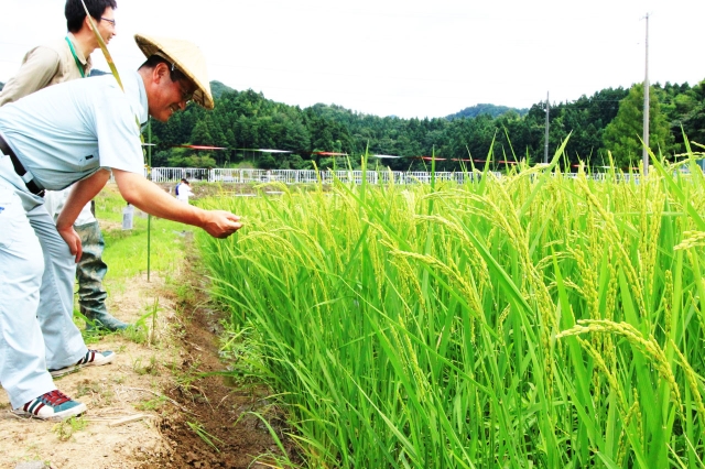 早期栽培越路早生に替わる新品種として試験栽培が進められている「新潟83号」のほ場。農協など関係者が生育状況を確認した=1日、刈羽村赤田町方