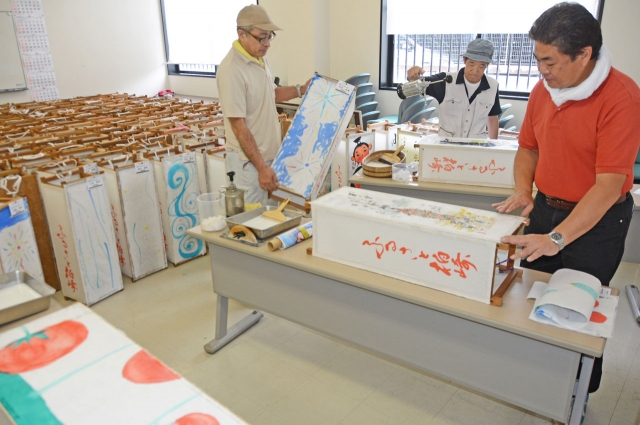 市内外から寄せられた作品をあんどんに仕立てる作業=7月31日、フォンジェ2階