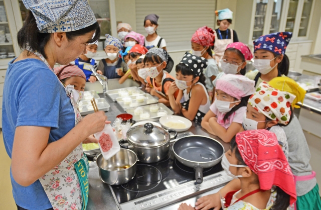 こども体験講座の一つ、料理講座。小学生が楽しく調理に取り組んだ=4日、市民プラザ