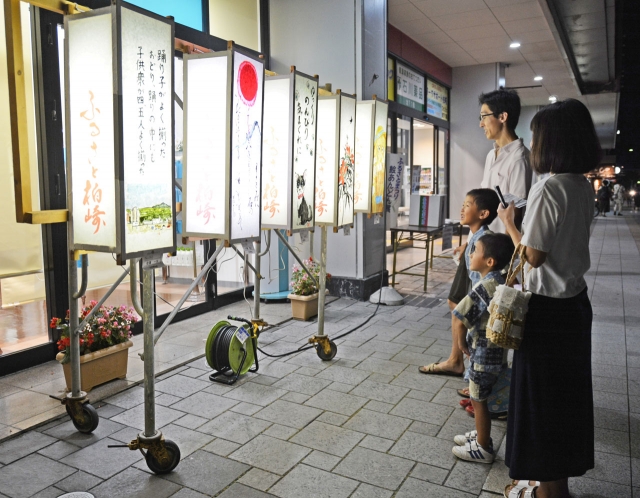 ずらりと並ぶ絵あんどん作品に見入る人たち=5日午後7時半ごろ、市内東本町1 (2017/08/07)