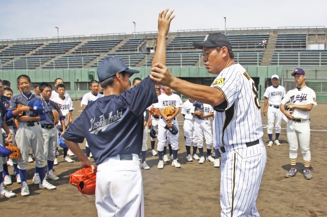 ボールの握り方やリリースポイントを指導する広沢さん。右が高橋さん=5日、佐藤池球場