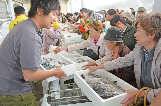 おさかな祭りで、大勢の人気を集めた地場産の魚介類の直売=4日、柏崎港観光交流センター「夕海」 (2017/06/05)