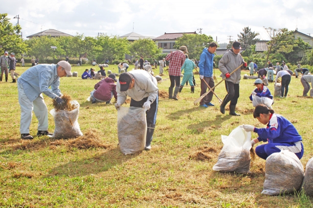 全市で行われた「クリーンデー柏崎」。松波町内会では地元中学生らも参加し、公園の草刈りなどに精を出した=4日、松波3 (2017/06/06)