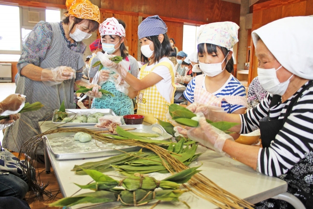 地域の人たちに教わりながら、笹団子作りに挑戦する田尻小3年生=8日、同校多目的室 (2017/06/09)