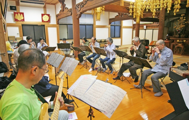 コンサートに向け、練習に熱を込める柏崎コカリナクラブ=市内東本町1、福厳院 (2017/06/10)