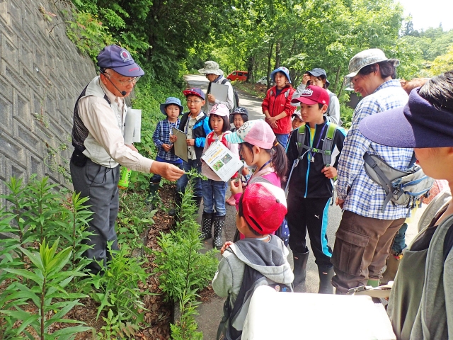 初夏の植物観察会で、いろいろな特徴などを学ぶ参加者=市内軽井川 (2017/06/13)