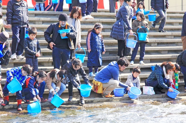 4年後の回帰を願って実施したサケの稚魚放流式=25日、市内青海川の柏崎さけのふるさと公園 (2017/03/27)
