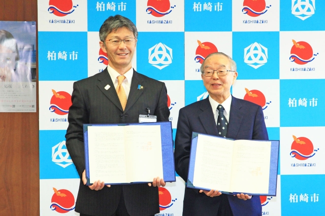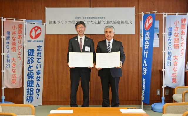 包括的連携協定を締結した協会けんぽ新潟支部の田中支部長(右)と桜井市長=27日、市役所市長応接室