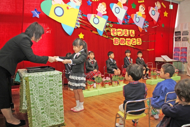 野田保育園の閉園式を兼ねた最後の卒園式。小俣園長から保育証書を受け取る卒園児=29日、同園遊戯室