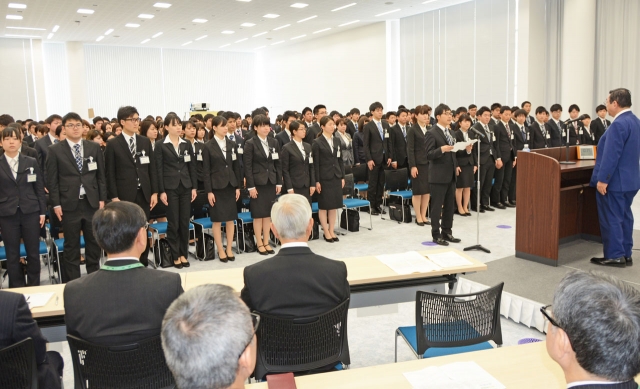 ブルボン入社式で吉田社長(右)に、決意を述べる新入社員代表=1日午前、市内駅前1の本社
