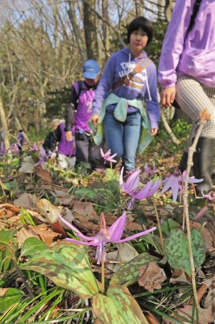 観賞会の参加者を出迎えたカタクリの花=3日、市内西山町別山の高内山 (2017/04/03)