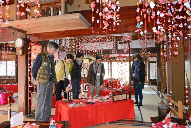 和の手仕事の楽しさを伝える「つるし雛かざり」展。訪れた人たちがじっくり見入っている=2日、市内新道の飯塚邸