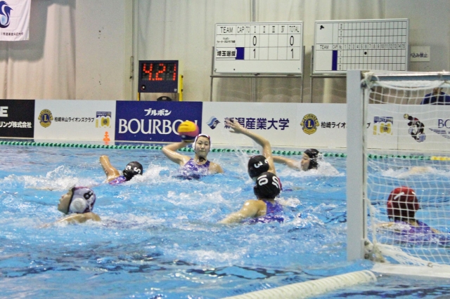 水球かしわざき潮風カップ女子予選のブルボンKZ(白色キャップ)―埼玉選抜戦でシュートを狙う前野理緒選手(中央)=17日午前、柏崎アクアパーク (2017/03/17)