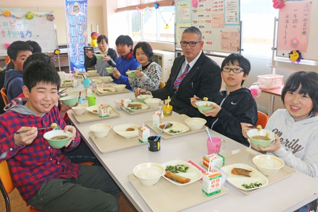 ブルボンKZのランコ・ペロビッチ監督と給食で交流する児童たち=17日、高柳小 (2017/03/18)