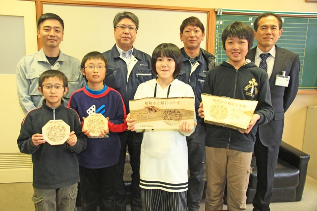 校庭の桜の枝がイラストを彫ったプレートになり、喜ぶ鯖石小児童 (2017/03/23)