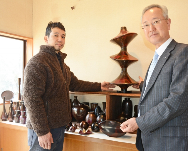 シンガポールでのコラボ事業に参加する原聡さん(左)と参加作品=市内大久保2の4代晴雲・原惣右エ門さんの工房  (2017/03/06)