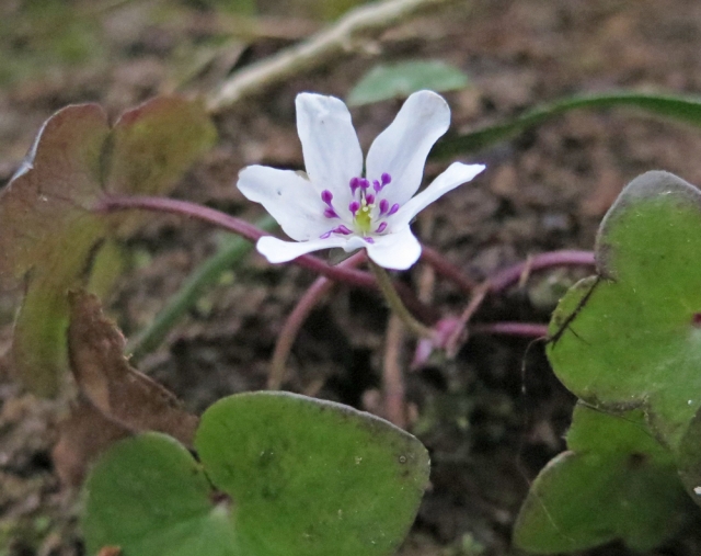 遊歩道でかれんな花を咲かせ始めた雪割草=9日、西山・大崎雪割草の里 (2017/03/10)