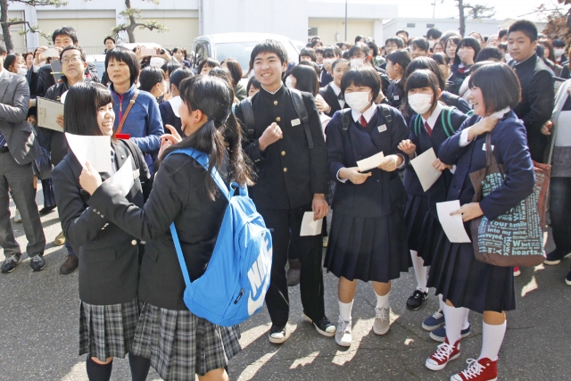 合格者の番号が張り出され、喜びに沸く受験生=13日午後2時ごろ、常盤高 (2017/03/13)