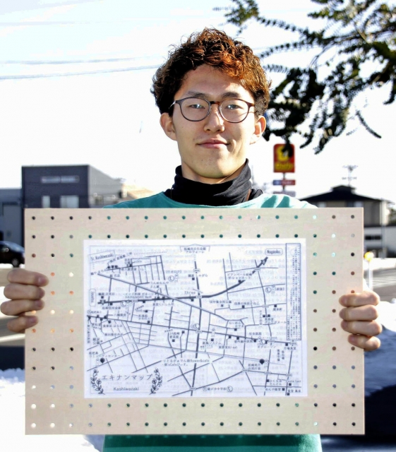 市内枇杷島・半田地区にスポットを当てた「エキナンマップ」と、製作した中村奨さん (2017/02/21)