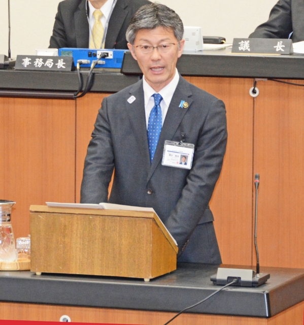 写真市議会2月定例会議の本会議で2017年度施政方針演説を行う桜井市長=24日午前 (2017/02/24)