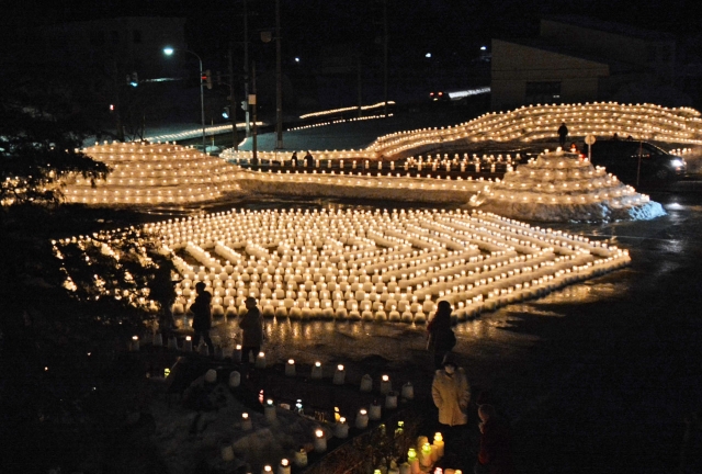 雪と3千本のろうそくの明かりで楽しませた「キャンドルフェスタ」=25日、野田コミセン前広場 (2017/02/28)