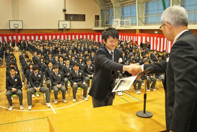 卒業証書を受け取り、巻口校長と握手を交わすクラスの代表生徒=1日午前、産大附属高体育館 (2017/03/01)