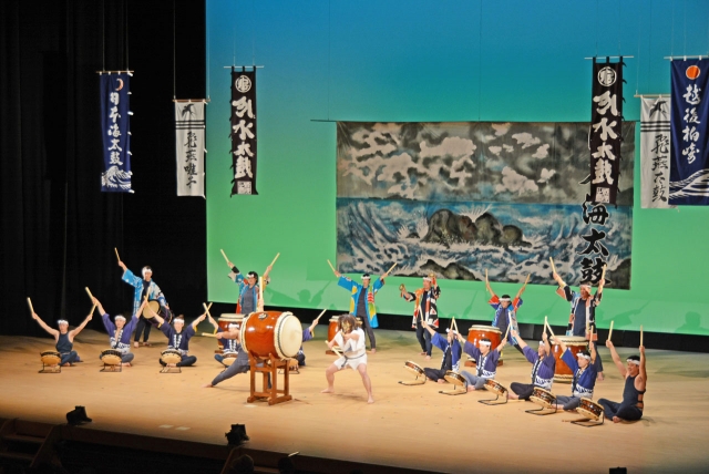 日本海太鼓の創立40周年公演「枹の響演」。「風神太鼓」の演奏でフィナーレを飾った=12日、アルフォーレ・大ホール (2017/02/13)