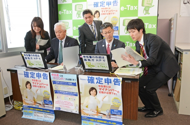 電子申告システムで入力する桜井市長(右から2人目)と品田村長、中央は市野沢署長=14日午前、柏崎税務署 (2017/02/14)